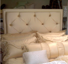 The Art Nouveau Fantasy beds are handmade of metal. A more contemporary style is upholstered. On the metal beds, the semiprecious stones – lapis, amethyst, rose quartz – are softly lit from behind. For the button-tufted upholstered headboards, the polished stones are button-shaped and incorporated into the tufting, which comes in 50 colors of silk shantung.
